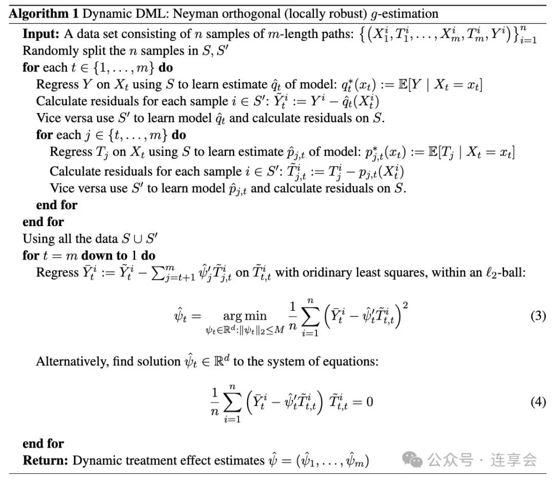 (Lewis and Syrgkanis, 2021) 中的 Algorithm1 伪代码展现了 DDML 的基础动态效应估计过程,可以用于处理高维状态变量。文章中还提到了其他扩展算法,感兴趣的读者可点击文末链接进行阅读。
