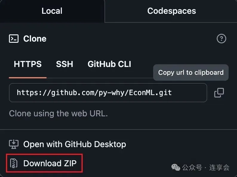 我们点击 Download ZIP 将官方的代码压缩包下载到本地,便于后续操作: