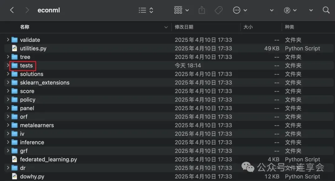 然后将前面下载的官方代码中的 tests 文件夹进行复制,粘贴到 econml 文件夹下,最终达到的效果应该是这样: