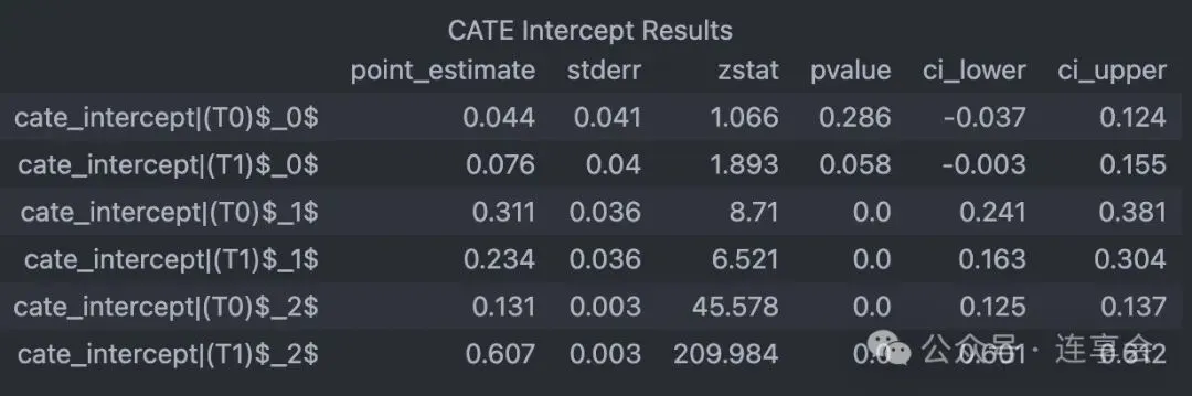 # 逐期处理效应(Period-specific treatment effects)for i, theta in enumerate(est.intercept_.reshape(-1, n_treatments)):# 输出:第 i+1 期的每个处理变量,对最终一期结果变量的边际效应 print(f"Marginal effect of a treatments in period {i+1} on period {n_periods} outcome: {theta}")# 输出逐期处理效应(Period Treatment Effects)及其置信区间(Confidence Intervals)est.summary()# 计算各期处理效应的置信区间(Confidence Intervals)conf_ints = est.intercept__interval(alpha=0.05)# alpha 设置成 0.01 就是 99% 的置信区间可以得到如下的 CATE 估计、p值和置信区间等: