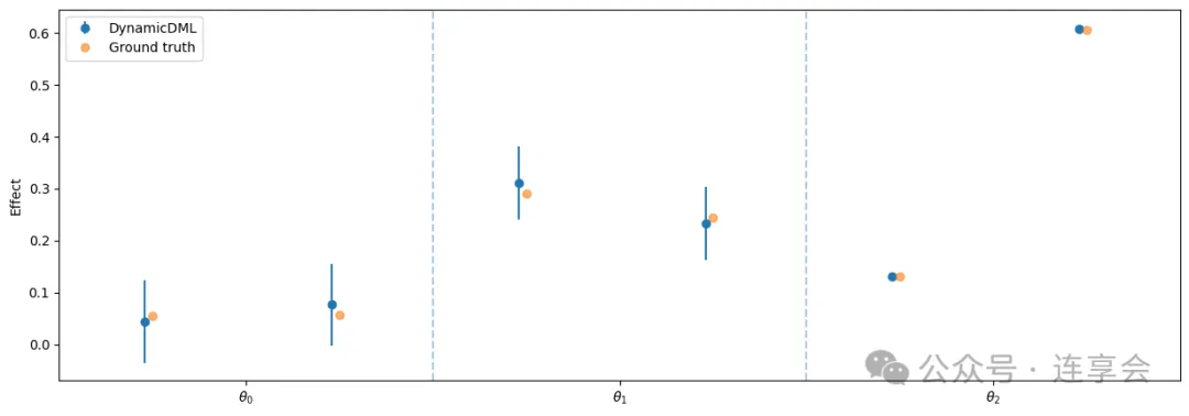 # 绘制各期处理效应及其置信区间(error bars)与真实效应对比图plt.figure(figsize=(15, 5)) # 设置图像大小为15×5英寸# 绘制 DynamicDML 估计的处理效应及其置信区间plt.errorbar( np.arange(n_periods * n_treatments) - .04, # x轴坐标(每个处理变量),稍微左移避免重叠 est.intercept_, # DynamicDML 估计的效应点 yerr=(conf_ints[1] - est.intercept_, # 上误差条 est.intercept_ - conf_ints[0]), # 下误差条 fmt='o', # 散点样式 label='DynamicDML'# 图例标签)# 绘制真实处理效应(Ground truth),用于与估计值对比plt.errorbar( np.arange(n_periods * n_treatments), true_effect.flatten(), # 真实效应,展开成一维 fmt='o', alpha=0.6, # 设置透明度 label='Ground truth'# 图例标签)# 在每个时期交界处画虚线分隔(帮助视觉区分不同时间段)for t in np.arange(1, n_periods): plt.axvline(x=t * n_treatments - .5, linestyle='--', alpha=.4)# 设置 x 轴刻度和刻度标签plt.xticks( [t * n_treatments - .5 + n_treatments/2for t in range(n_periods)], # 每个时间段中间的位置 ["$\\theta_{}$".format(t) for t in range(n_periods)] # 标签)plt.gca().set_xlim([-.5, n_periods * n_treatments - .5]) # 设置x轴范围plt.ylabel("Effect") # 设置y轴标签plt.legend() # 显示图例plt.show() # 显示图像画出图如下: