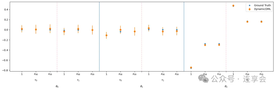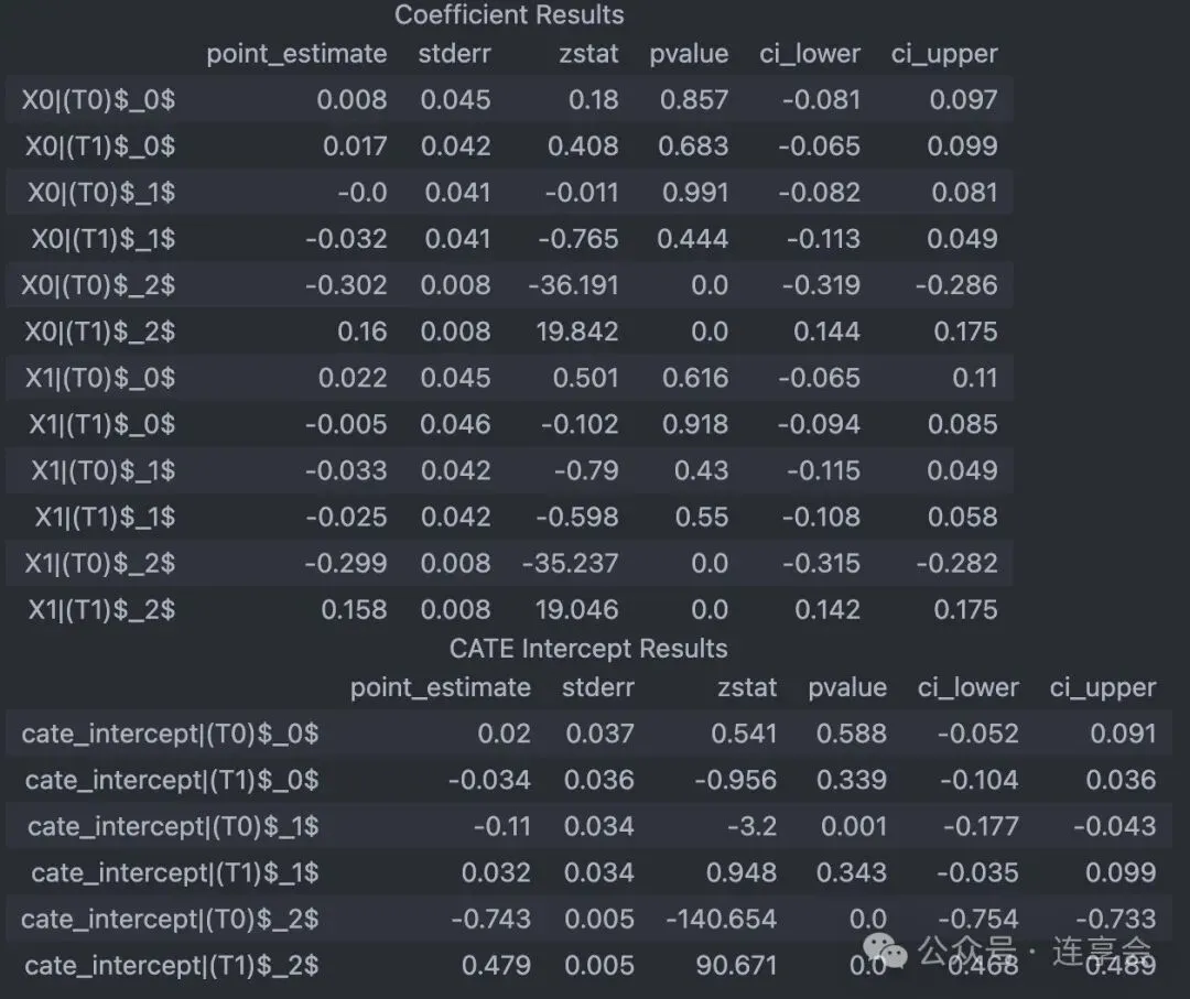 # 测试点的平均处理效应X_test = X[np.arange(0, 25, 3)]print(f"Average effect of default policy:{est.ate(X=X_test):0.2f}")# 目标政策相对于基准政策的效应# 必须为每个时期指定一个处理baseline_policy = np.zeros((1, n_periods * n_treatments))target_policy = np.ones((1, n_periods * n_treatments))eff = est.effect(X=X_test, T0=baseline_policy, T1=target_policy)print("Effect of target policy over baseline policy for test set:\n", eff)# 系数:截距为 n_treatments*n_periods coef_ 的形状(n_treatments*n_periods, n_hetero_inds),# 前 n_treatment 行来自第一期,后 n_treatment 行来自第二期。est.intercept_, est.coef_# 置信区间conf_ints_intercept = est.intercept__interval(alpha=0.05)conf_ints_coef = est.coef__interval(alpha=0.05)代码如下: