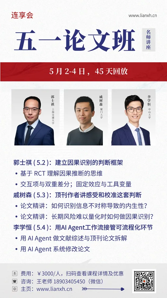 连享会:2026五一论文班 · 线上时间:5月2-4日嘉宾:郭士祺 (上海交通大学)、戚树森 (厦门大学)、李学恒 (中山大学)咨询:王老师 18903405450(微信)