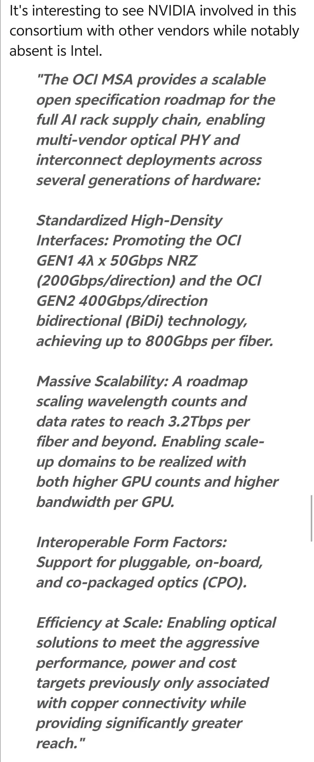 在此次OCI 联盟的 press release 中,特别提到新规范结合了NRZ 调制和波分复用 (WDM)技术,并将连接范式从模块转向硅基。这种“硅光一体”的思路,或许正是 Intel 缺席背后,不同技术路线博弈的伏笔——毕竟,Intel 曾在硅光领域深耕多年,如今的缺席是战略放弃还是另辟蹊径?值得玩味。