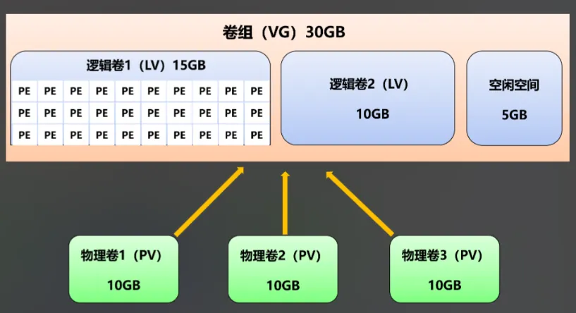 2. VG(卷组):由1个或多个PV组成的“存储池”,把分散的物理空间整合到一起;