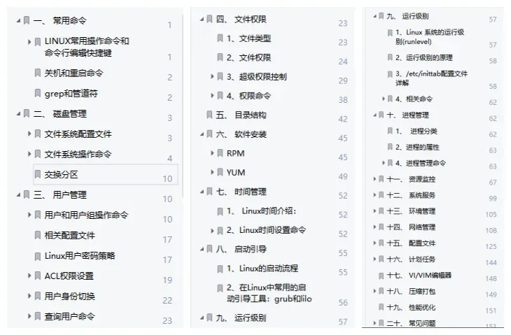 接下来简单介绍一下这份Linux学习笔记,PDF一共有154页,非常全面和详细,包括 Linux 常用命令、Linux 常用操作、网络管理、性能优化等等,几乎覆盖了 Linux 基础学习的方方面面,非常适合初学者入门: