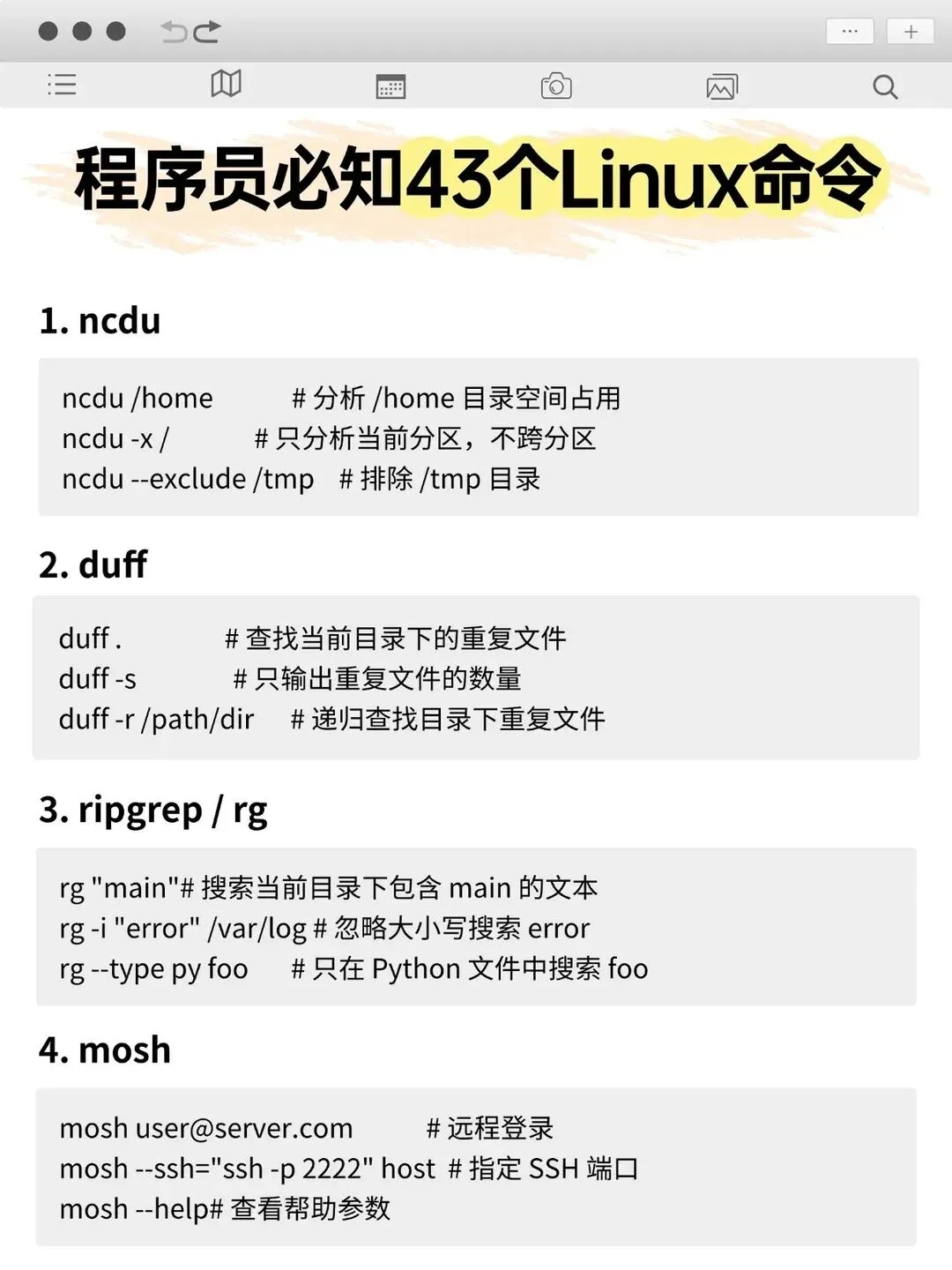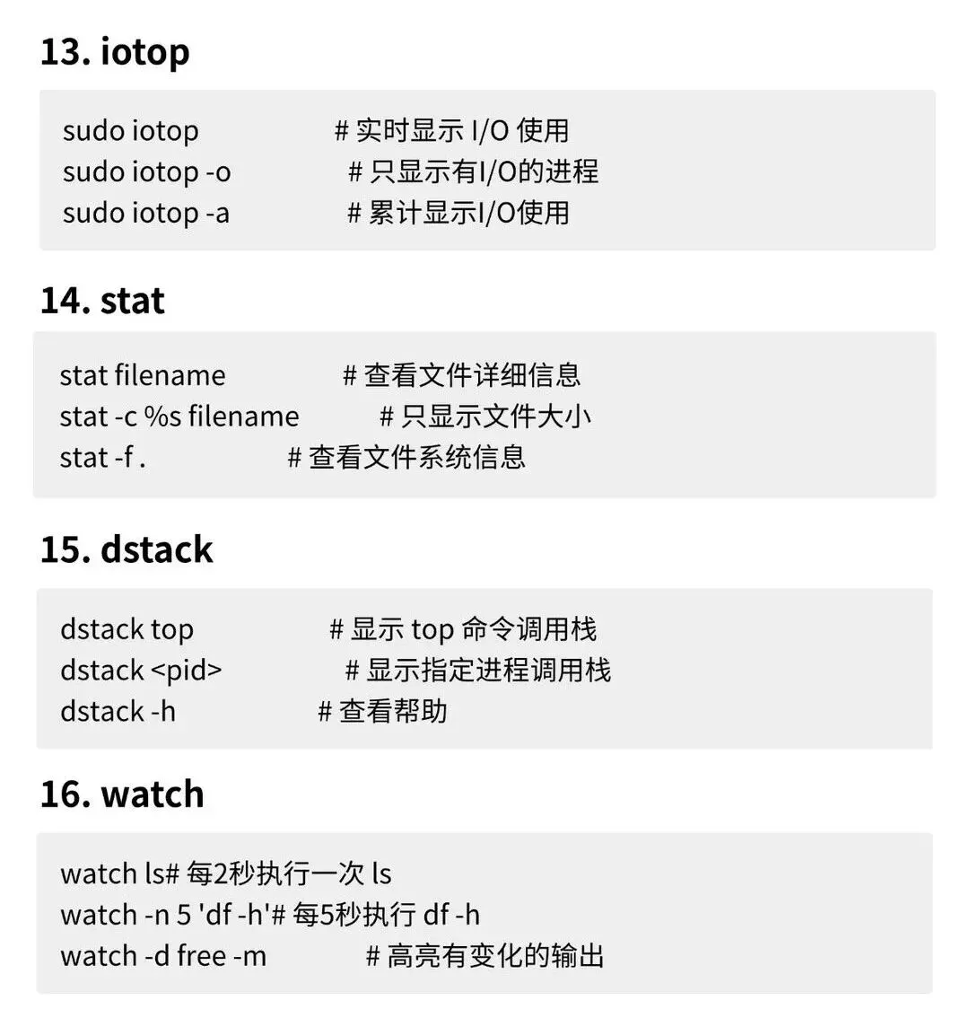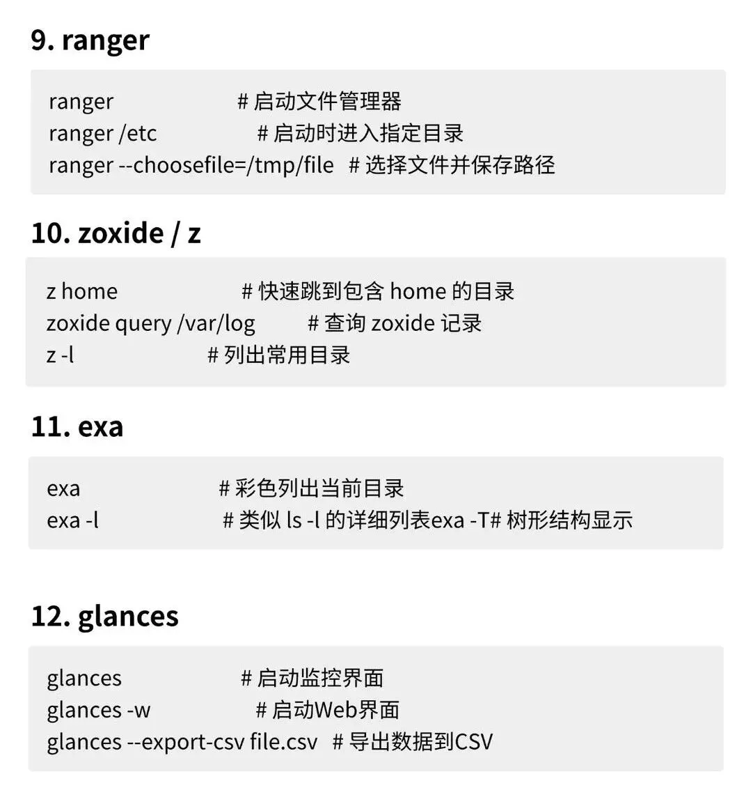 今天我为你整理了43个你必须知道的Linux命令,每个命令附带3个经典实用范例,覆盖文件管理、系统监控、网络诊断、性能分析等多个高频场景。部分命令可能需要额外安装软件包,都给大家整理好了,建议收藏!