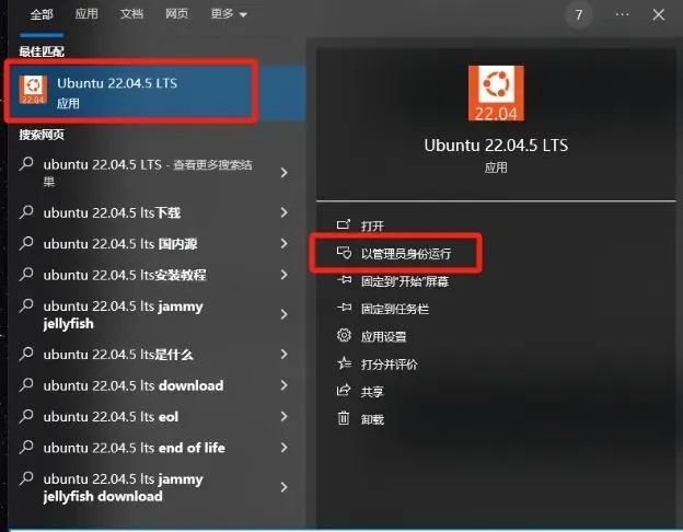 windows系统“开始”中搜索Ubuntu 22.04.5 LTS,并使用管理员身份运行。3.关闭WSL