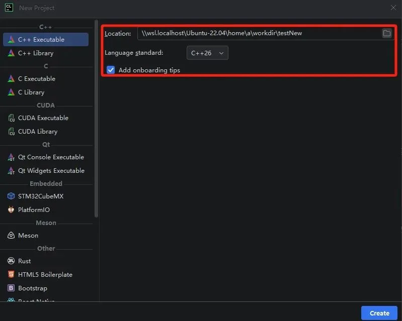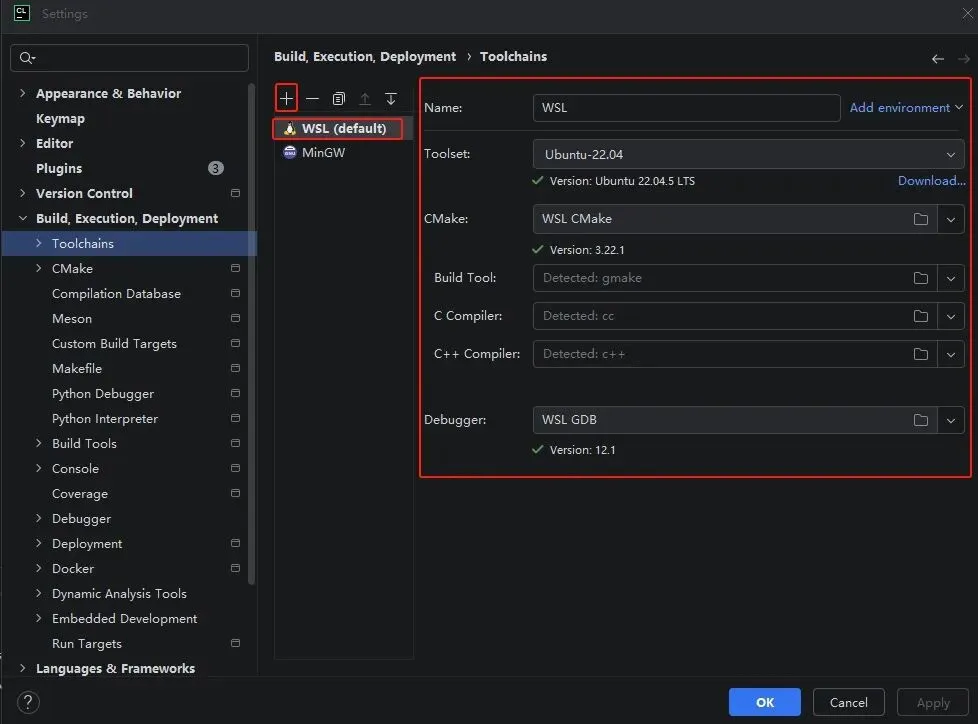 - 点击符号“+”,选择WSL,CLion自动检测并识别安装的WSL版本及其内部相关配置(CMake、GDB等)。