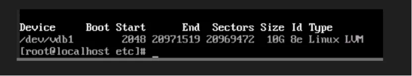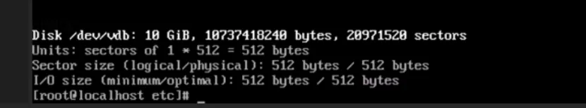 2、在虚拟机上,新增硬盘10GB。执行命令:fdisk -l查看新增硬盘是否存在。这里,我们看到了/dev/vdb这块10GB的硬盘。