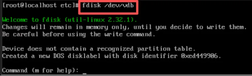 3、执行命令,对/dev/vdb进行格式化操作,命令为:fdisk /dev/vdb。键入:m(获取帮助)如下: