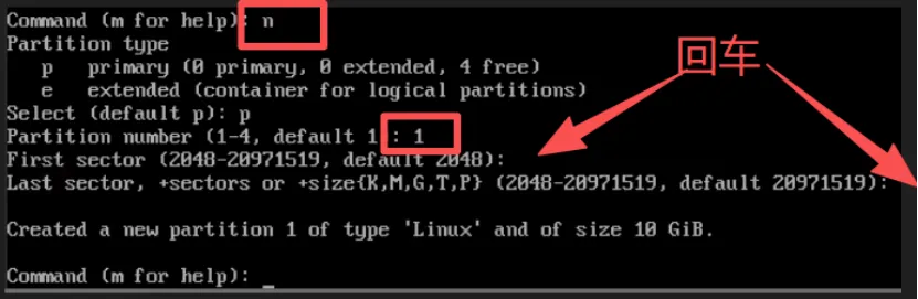 4、输入n,再输入p,表示为做个主分区;第一个输入1,表示第一个分区,或者敲回车,系统会默认做分区,后面可以默认选择敲回车,表示将硬盘里面的容量全部扩充到刚才的分区。