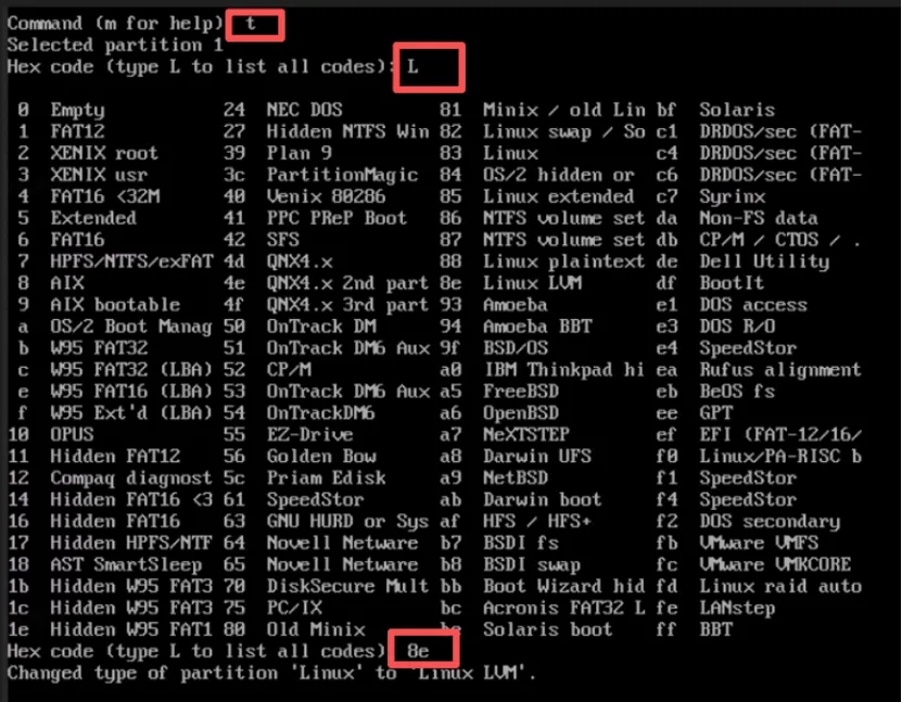 5、按m(获取帮助)输入t,表示修改分区类型。敲回车后输入8e,表示将分区做成LVM格式,最后一定要键入w,保存。再次执行fdisk -l,发现已经有了vdb1分区,系统类型是linux LVM。