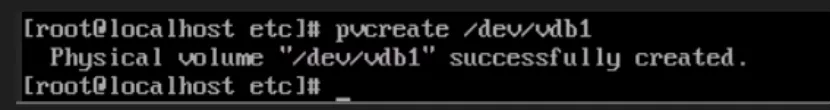 6、输入命令:pvcreate /dev/vdb1,将刚才的硬盘分区创建为物理卷。