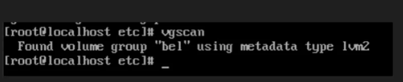 7、使用vgscan命令,查询物理卷名称,本文中服务器卷组名称为:bel
