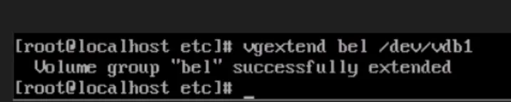 8、将新增的物理卷扩容到卷组bel中,执行命令:vgextend bel/dev/vdb1