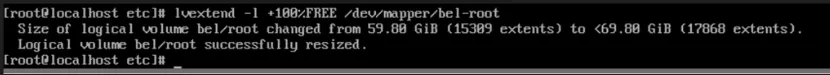 9、从卷组里面扩容容量到根目录对应的逻辑卷中,本文中将卷组所有的容量扩充到根目录的逻辑卷内。输入命令:lvextend -l +100%FREE/dev/mapper/bel-root。也可以按容量进行扩容,执行命令:lvextend -L +10G /dev/mapper/bel-root