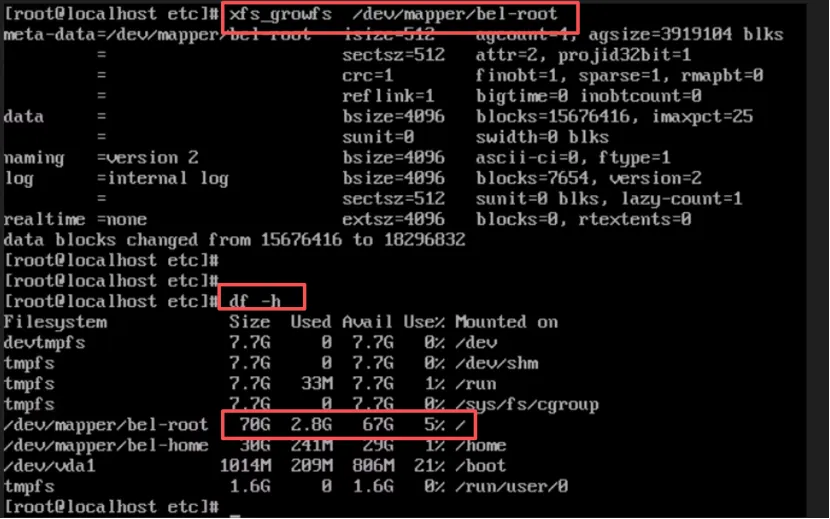 10、此时,执行df -h,查看挂载点占用率没有变化。因为,系统还不识别刚刚添加进来的文件系统,要对文件系统进行扩容,执行命令xfs_growfs想要扩容的路径,或者resize2fs -f 想要扩容的路径。此时,硬盘已完成扩容。