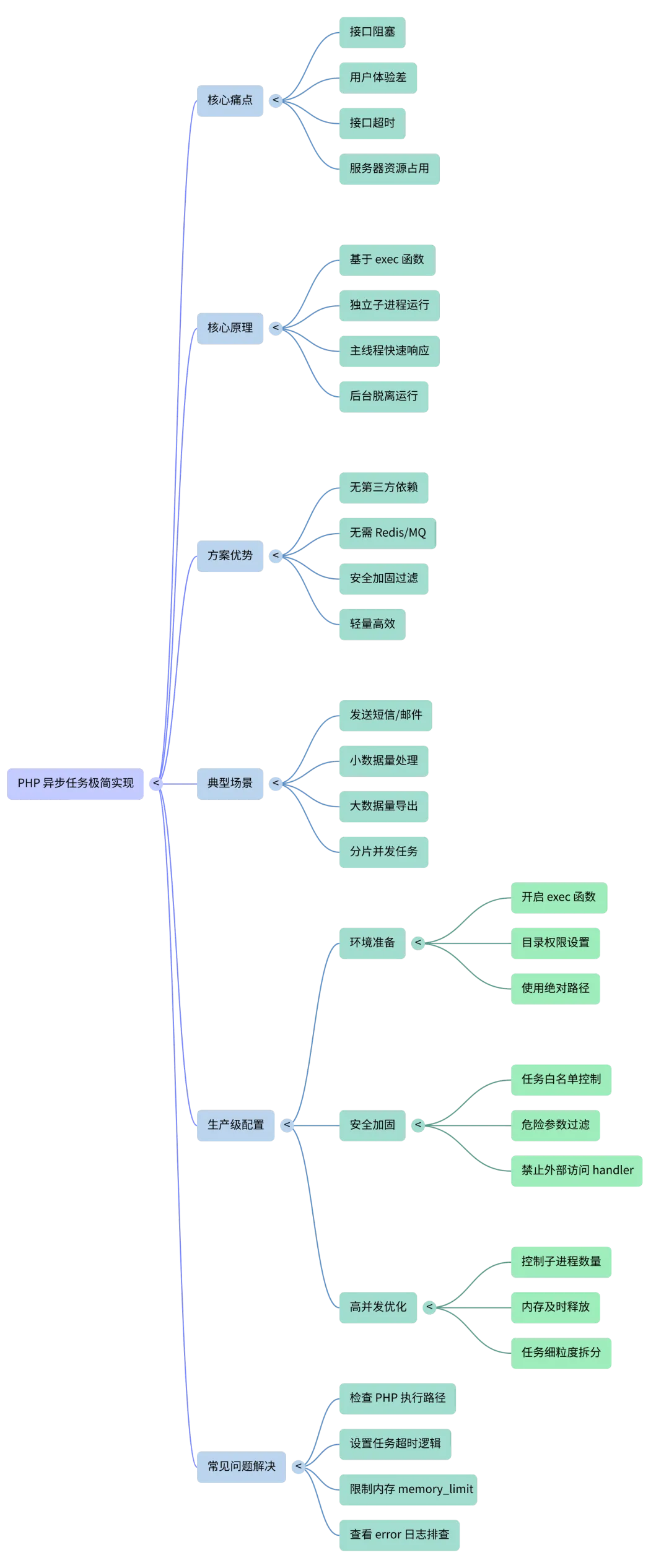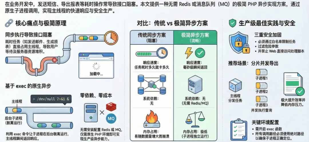 今天给大家带来 PHP7+ 异步任务极简版:无第三方依赖、无需队列、一行调用、安全加固,原生 PHP 就能跑,彻底解决接口阻塞问题,小项目/快速迭代直接上线,生产级可用。