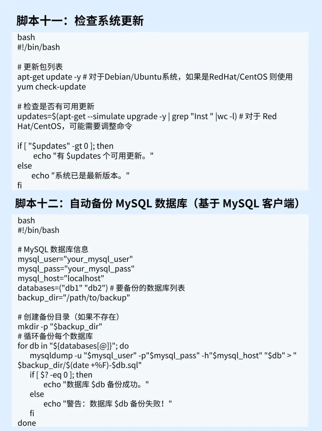 宝子们!做 Linux 运维或日常操作,是不是天天重复备份文件、监控进程、清理日志?机械操作又累又容易错,加班到崩溃?这份《127 个Linux 脚本 》直接解放双手!它覆盖了所有高频重复场景:定时备份数据库、自动清理 7 天前日志、进程挂了自动重启,甚至连批量修改文件名、统计文件夹大小都有现成脚本。每个脚本都标清用途、参数说明,还有注释讲解关键逻辑,下载下来改改路径就能用。我之前每天花 1 小时手动备份,用了脚本后直接定时执行,省出时间摸鱼!这么能提升效率的脚本集,不收藏真的亏,赶紧码住,告别重复劳动!网络安全全套视频教程、课件源码、学习笔记、项目等已打包📦好,有需要学习的宝们厚台关祝一下点“学习”即🉑拿走!会手把手带你学技术,上手实操!