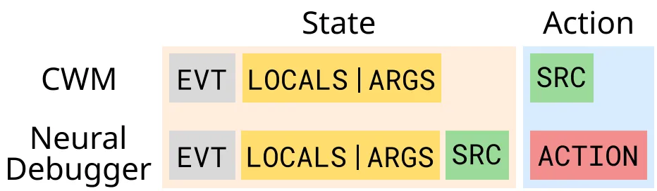 图:神经调试器与CWM的状态-动作结构对比。CWM的动作是固定的(执行下一行),而神经调试器的动作由用户控制,决定了状态的跳转方式。