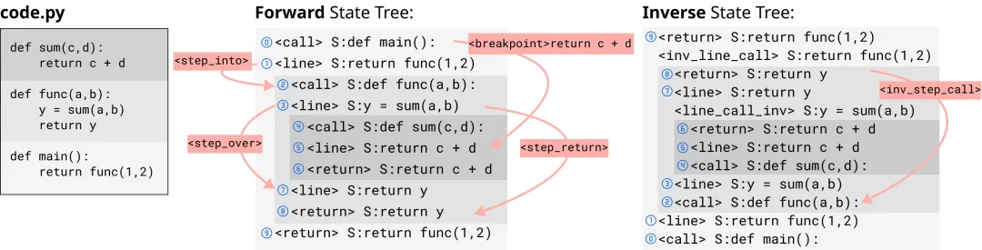 图:状态树与转换规则。左:Python代码。中:由执行轨迹构建的正向状态树(缩进表示调用深度)。右:对应的逆向状态树。蓝色数字表示正/逆向树节点间的对应关系。