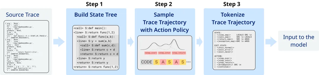 图:神经调试器数据生成流水线。从原始执行轨迹 -> 构建状态树 -> 按策略采样调试轨迹 -> 格式化为模型可理解的文本序列。