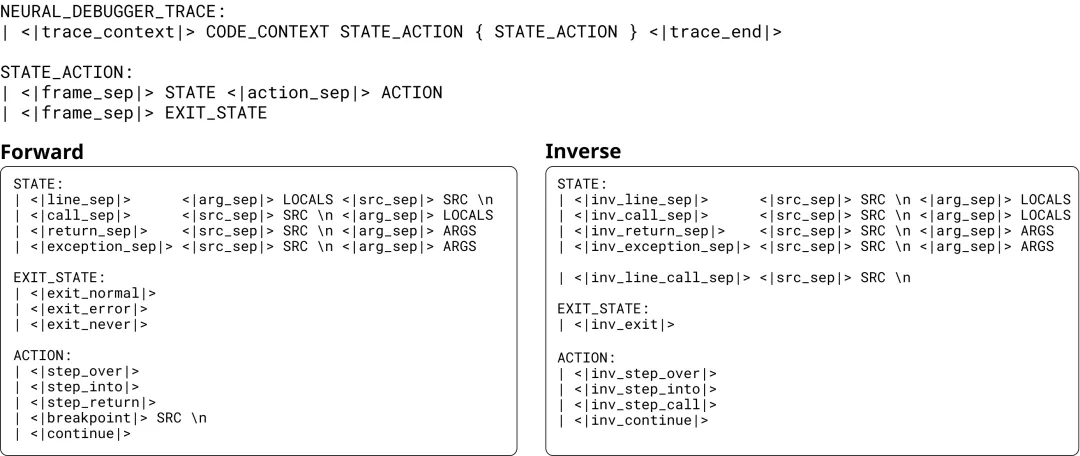 图:神经调试器数据的正式语法。定义了状态和动作如何被序列化为特殊的标记序列。
