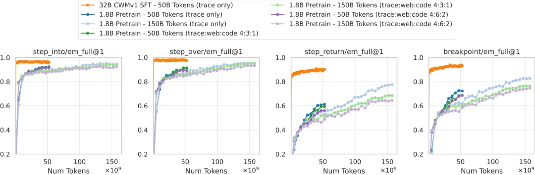 step_into、step_over这类单步动作的准确率很快达到90%以上,而breakpoint、step_return这类需要跨越多行的跳转动作学习起来更慢,但最终也能达到不错水平。 - 小模型也能成为不错的调试器:从头训练的1.8B小模型,在经过足够数据训练后(150B tokens),其单步动作的准确率与微调后的32B大模型差距不大。这说明神经调试器的能力主要来自于对执行轨迹数据的学习,而非单纯的模型规模。
