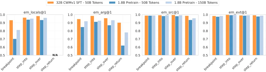- 微调大模型:对一个已预训练过代码执行轨迹的 32B 参数 CWM 模型,使用纯调试器轨迹数据进行了 50B token 的微调。