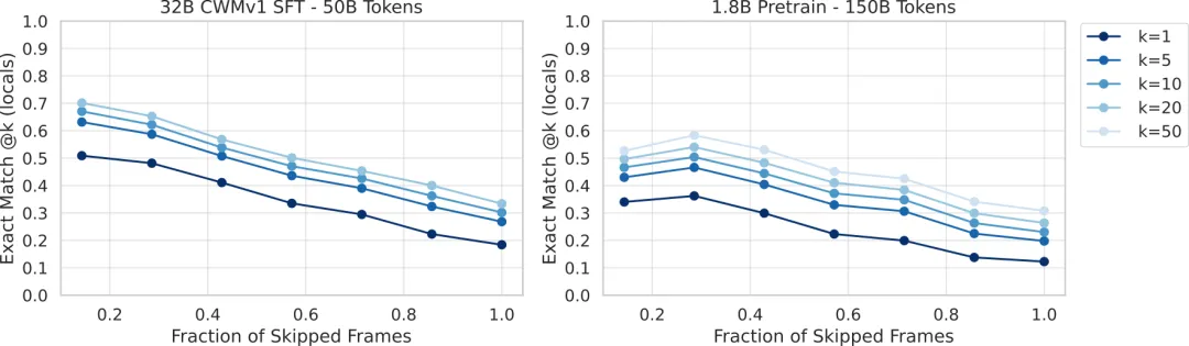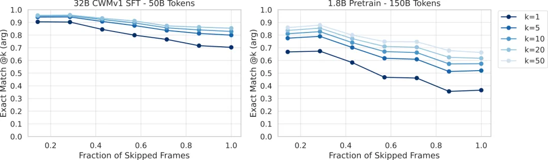 图:输入预测准确率随预测跨度(需跳过的中间状态比例)的变化。跨度越大(越接近1),预测越难;通过采样多个结果(@k)可以缓解这一问题。