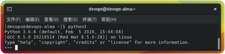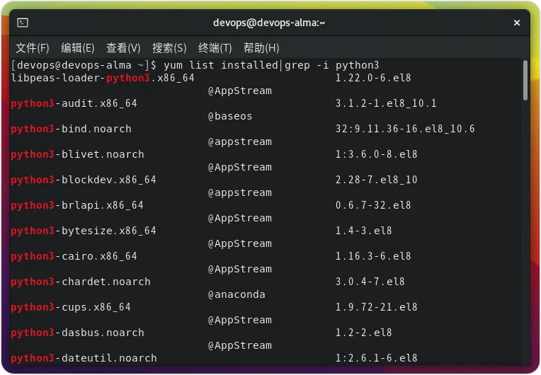 如果上述命令没有输出,这意味着您的系统上没有 Python3。如果系统提示 command not found,则表示 Python3 未安装。3. 在 AlmaLinux 上安装 Python 3 和 PIP