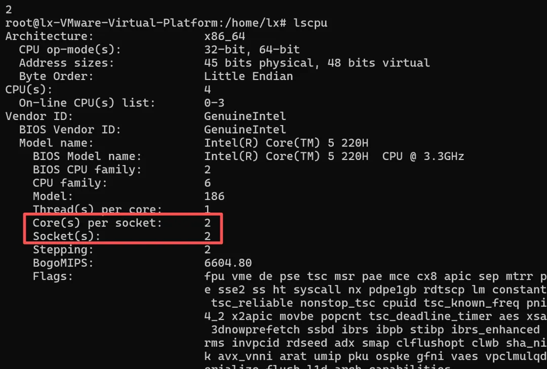 Core(s) per socket为每颗CPU的核心数,Socket(s)为物理CPU颗数