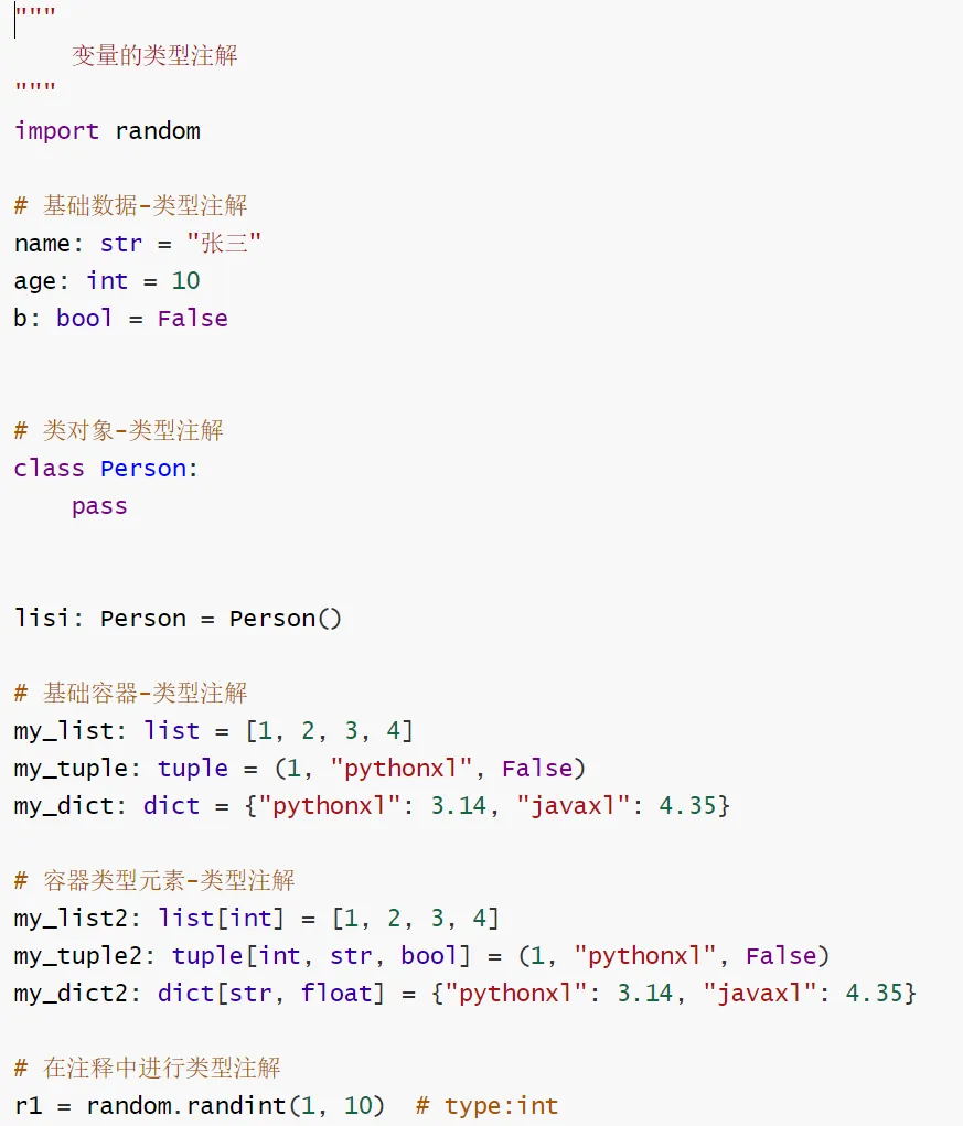 注释式类型注解:对于无法直接标注的情况,可以使用 # type: 类型 的注释形式,为变量添加类型说明。