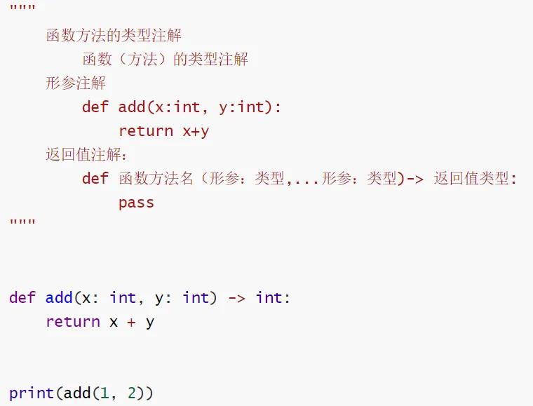 函数返回值类型注解:在函数定义的括号后,使用 -> 返回值类型 的语法,明确标注函数返回值的类型。