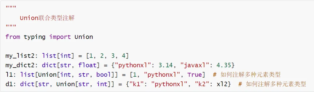 Union 联合类型的导入:使用联合类型注解需从 typing 模块中导入 Union。
