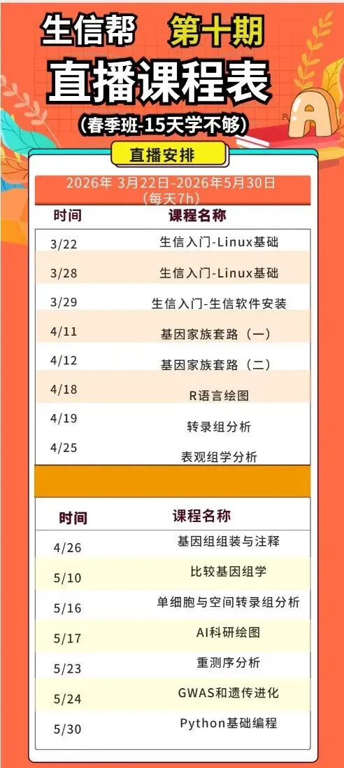 想用生信快速发表一篇SCI吗?生信帮专属生信课程,拒绝冗余理论,聚焦实战落地,适配零基础小白、科研党,从Linux、Python基础,到基因家族,转录组、重测序全套流程,再到图表绘制、手把手教学、专属导师答疑,服务器实操+定制化脚本直达成果。无需盲目摸索,不用踩软件、流程,高效搞定课题、实现SCI文章快速发表。现在报名还有少量五折券(券后5999)!赶紧来加微信SXHelp01锁定吧!