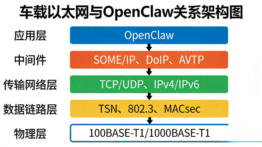 ┌─────────────────────────────────┐│ 应用层:OpenClaw(AI智能体、任务编排)│├─────────────────────────────────┤│ 中间件:SOME/IP、DoIP、AVTP │├─────────────────────────────────┤│ 传输/网络层:TCP/UDP、IPv4/IPv6 │ ← Linux内核网络栈├─────────────────────────────────┤│ 数据链路:TSN、802.3、MACsec │├─────────────────────────────────┤│ 物理层:100BASE-T1/1000BASE-T1 │└─────────────────────────────────┘