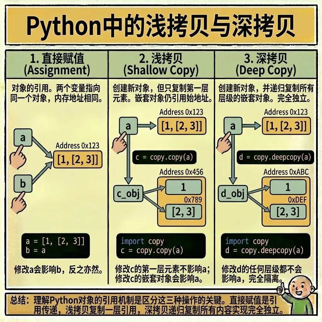 总结:今日我们学习了Python基础篇-Python中的浅拷贝与深拷贝。核心区别在于是否复制嵌套对象的内存地址:直接赋值仅共享同一内存地址,修改会互相影响;浅拷贝仅复制第一层元素地址,外层修改互不影响,但嵌套对象仍共享地址,修改会互相作用;深拷贝则会递归复制所有层级地址,创建完全独立的新对象,原对象与新对象的所有修改均互不影响。总之,单层数据用浅拷贝更高效,嵌套数据若需完全独立则需用深拷贝。在Python基础篇,后续我们将持续学习Python基础知识,祝每一位study er学习愉快。