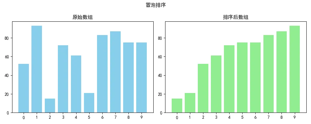 import matplotlib.pyplot as pltimport numpy as npdef bubble_sort(arr): n = len(arr) for i in range(n-1): for j in range(n-i-1): if arr[j] > arr[j+1]: arr[j], arr[j+1] = arr[j+1], arr[j] return arrdef plot_sort(original, sorted_arr, title): fig, (ax1, ax2) = plt.subplots(1, 2, figsize=(10, 4)) x = range(len(original)) ax1.bar(x, original, color='skyblue') ax1.set_title('原始数组') ax1.set_xticks(x) ax2.bar(x, sorted_arr, color='lightgreen') ax2.set_title('排序后数组') ax2.set_xticks(x) plt.suptitle(title) plt.tight_layout() plt.savefig(f'{title}.png', dpi=150) plt.show()if __name__ == '__main__': np.random.seed(42) # 固定随机种子,让结果可重现 original = np.random.randint(1, 100, 10) sorted_arr = bubble_sort(original.copy()) plot_sort(original, sorted_arr, '冒泡排序')