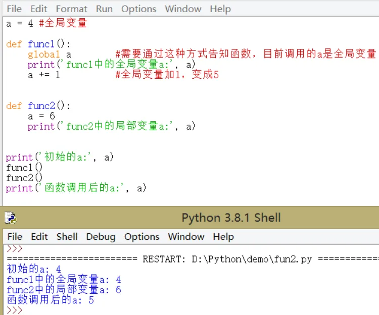 定义在函数内部的变量拥有一个局部作用域,定义在函数外的变量拥有全局作用域,全局作用域的变量如果在函数内被赋值,则这个局部变量覆盖了全局变量,该改变仅函数体内有效。如果需要在函数体内使用全局函数,用global申明后使用。