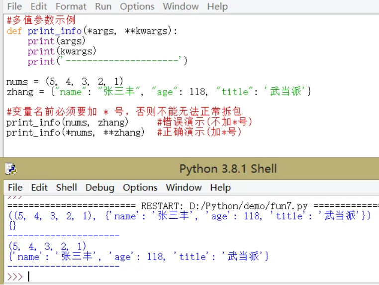 在上面多值参数传递时,实际使用了拆包功能。拆包主要用于元组和字典参数的传递。在调用带有多值参数的函数时,使用拆包简化参数的传递: