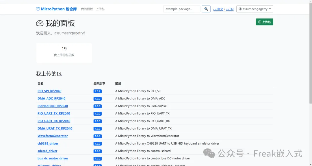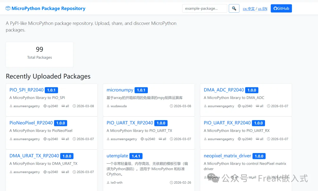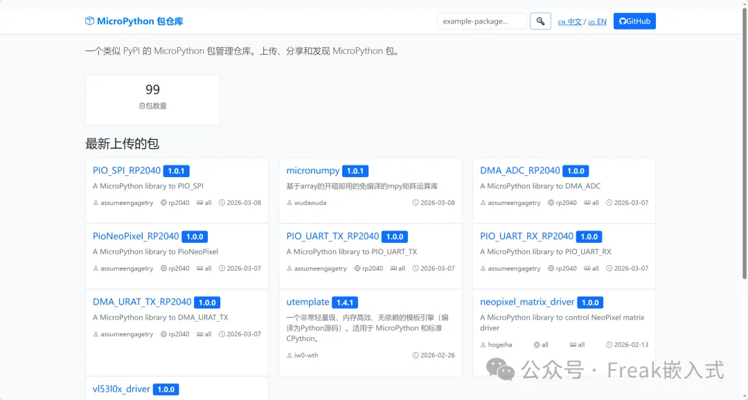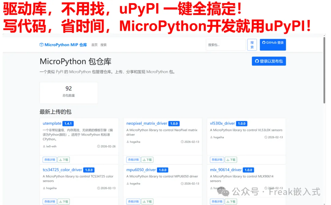 于是,uPyPi(https://upypi.net/) 应运而生 —— 它是一个专门为 MicroPython 打造的包管理仓库,就像 “MicroPython 版的 PyPI”,让开发者可以轻松上传、分享和发现驱动包,彻底解决了早期的库管理难题。