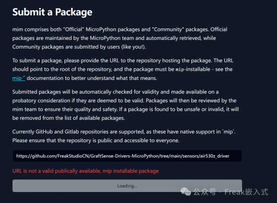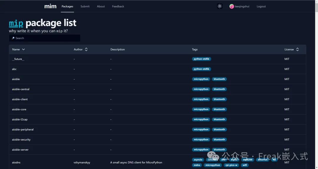 后来,MicroPython 社区推出了 mip(mip installs packages)工具,类似 Python 里的 pip,可以自动下载和管理包。但默认的索引是 micropython-lib,第三方库的发布和发现还是不够方便。