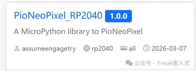package.json 文件,统一定义 name、version 等核心元数据,保障包的一致性与兼容性。 - 硬件 / 固件精准适配支持按硬件型号(如 RP2040)、固件环境筛选适配的包,解决不同硬件 / 版本环境下的适配难题。
