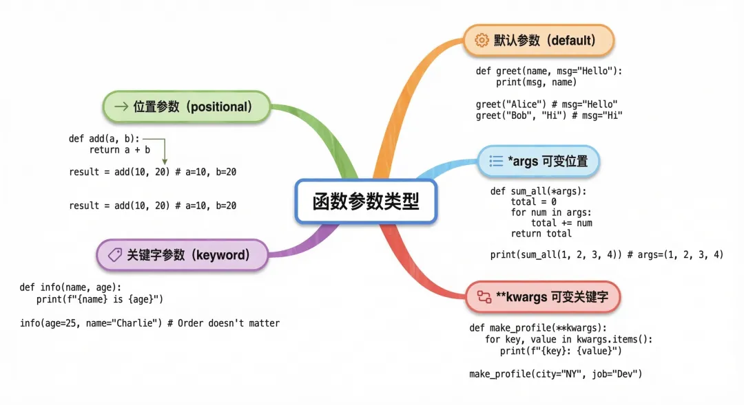 def create_user(name, age, city="北京"): return f"{name},{age}岁,来自{city}"# 位置参数(按顺序)print(create_user("Alice", 28))# 关键字参数(指定参数名,顺序可以随意)print(create_user(age=28, name="Alice"))print(create_user("Bob", city="上海", age=30))