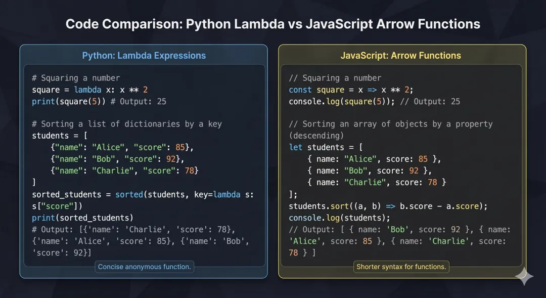 Python 的函数整体和 JS 非常相似——都是一等公民,都可以作为参数传递,都支持匿名函数。但有几个 Python 特有的特性,比如 *args、**kwargs、关键字参数,是 JS 里没有直接对应物的,理解它们是迈向 Python 进阶的关键一步。