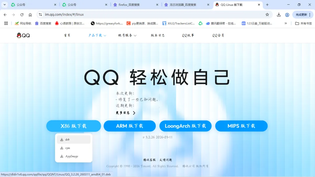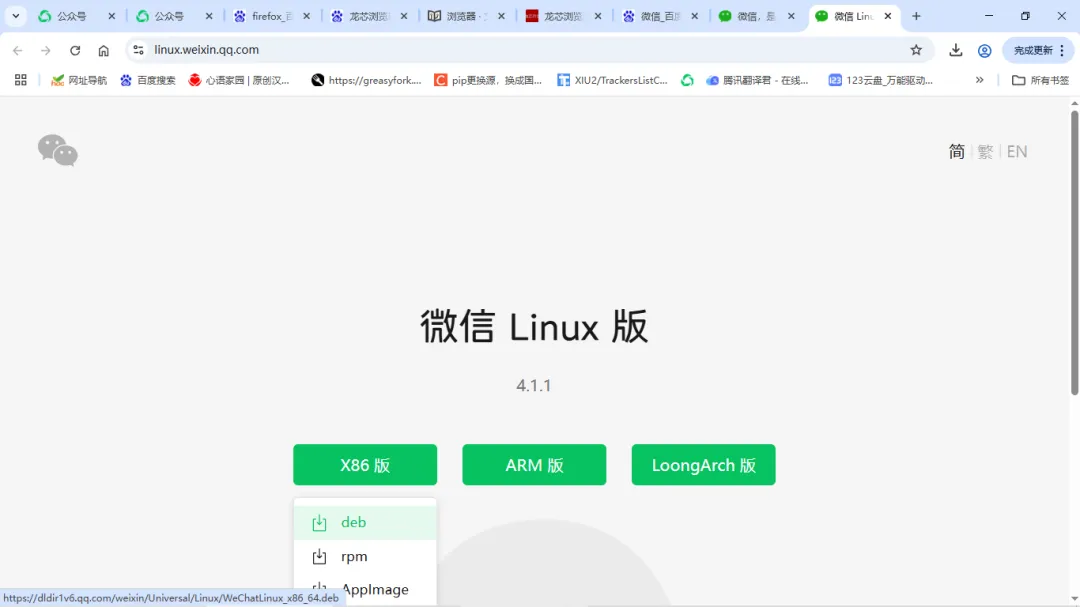 谷歌浏览器,相信大家都不陌生。它快速、安全且免费,很好地满足新型网站对浏览器的要求。简洁、快速,支持多标签浏览。>deepin系统到应用商店搜索“谷歌浏览器”下载>其他系统点下载地址:https://www.google.cn/chrome/index.html(担心下到盗版chrome的话,可以去应用商店或软件源下载)微软基于Chromium开发的浏览器。跟Chrome不同的是,能登录微软账号同步书签,不用开魔法也能进自家商店装插件,还有针对Linux的性能优化(启动速度好快)。https://www.microsoft.com/zh-cn/edge/download?form=MA13FJ火狐浏览器,由非营利组织Mozilla开发的免费浏览器。体积小、速度快、不过度收集隐私、对注重隐私的用户非常友好。也能同步书签,定制界面等。大部分的发行版预装的浏览器就是Firefox。>Firefox已预装,无需官网下载。追新版,来这:https://download-installer.cdn.mozilla.net/pub/firefox/releases/148.0.2/linux-x86_64/zh-CN/firefox-148.0.2.tar.xz龙芯中科官方基于Chromium开发的浏览器。干净、无广告、速度快(对国内Linux用户做了深度优化)、支持国家商用密码算法模块和国产安全协议模块,还支持自定义功能及外观。是笔者心中的“国产软件之光”。https://ftp.loongnix.cn/browser/lbrowser/3.4.2082.1/amd64/lbrowser_3.4.2082.1-1.stable.amd64.deb>deepin系统到应用商店搜索“龙芯浏览器”下载近几年,随着Linux用户的增多,腾讯推出了微信Linux版。聊天、加友、朋友圈、小程序、适配号等已经适配,支持聊天记录导入导出,使用体验跟Windows端毫无二致。>下载地址:https://linux.weixin.qq.com/https://dldir1v6.qq.com/weixin/Universal/Linux/WeChatLinux_x86_64.deb一代网民的青春。QQ支持Linux的时间远比微信早(2008年),后来界面大改版(2022年),新界面也是最先用在Linux上。功能上,不仅支持基本的交流和聊天记录导入导出,还支持超级调色盘免费换界面。>下载地址:https://im.qq.com/index/#/linuxhttps://dldir1v6.qq.com/qqfile/qq/QQNT/Linux/QQ_3.2.26_260311_amd64_01.deb