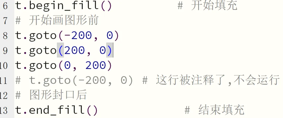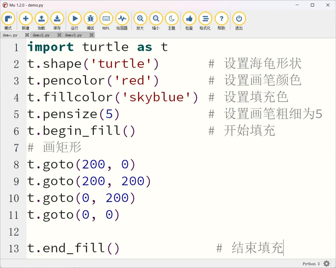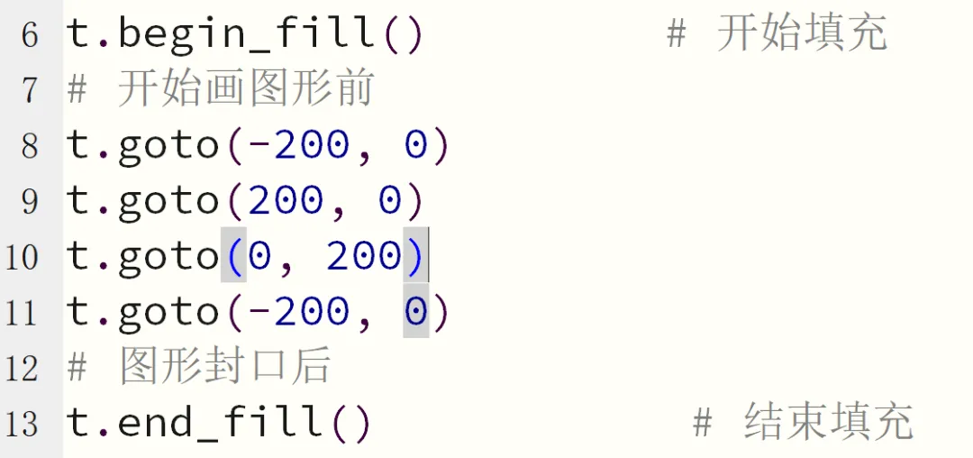 fillcolor():设置填充颜色。begin_fill() 和 end_fill():告诉海龟“我要开始涂色了”。