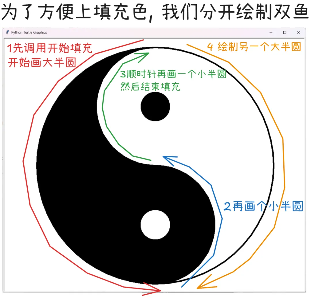 小海龟已经不只是会走路了,它现在能画出带哲学意味的图案。 今天我们玩的是图形和颜色,最后拼出了太极图。